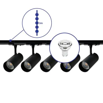 Complete Set 1-Phase Rail 3 Meter Black | incl. 5x Spot + GU10 2700K 3W Dimmable + End Cap, Power Connector and I-Connector